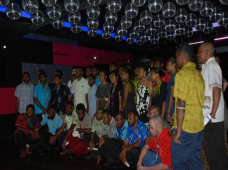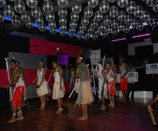 講話結(jié)束后,迎來(lái)了今晚第一個(gè)文藝表演—開(kāi)場(chǎng)舞蹈。舞蹈由POM VARAHE員工自發(fā)組織,結(jié)合當(dāng)?shù)匚幕厣约癇NBM各分店發(fā)展歷程進(jìn)行編排。舞蹈隊(duì)伍由1名主持人、4名伴奏員、13名舞者和10名展示者組成。整個(gè)表演分成兩個(gè)環(huán)節(jié)進(jìn)行,先由舞蹈主持人AIVA分別介紹每個(gè)分店的成立時(shí)間,伴隨著莊重而又嚴(yán)肅的奏樂(lè)聲,展示者代表分店高舉展示牌向觀眾們展示,展示牌完全由員工手工制作而成,并插上每個(gè)分店所在地區(qū)的省旗。展示完畢后,奏樂(lè)節(jié)奏突然歡快起來(lái),舞蹈員們穿著傳統(tǒng)草裙,佩戴貝殼和種子首飾,畫(huà)著臉譜,在舞臺(tái)上載歌載舞,點(diǎn)燃了整個(gè)現(xiàn)場(chǎng)氣氛。