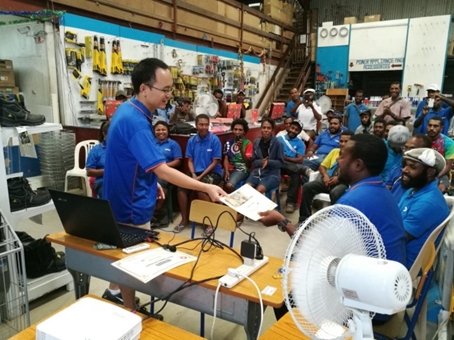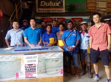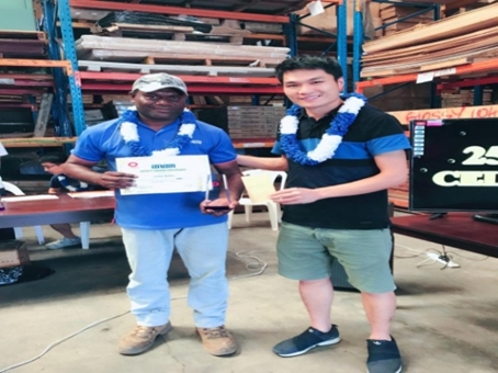 視頻播放結(jié)束后,迎來(lái)了本次大會(huì)的重頭戲---頒獎(jiǎng),POM VARAHE店長(zhǎng)吳凱對(duì)工作滿10周年員工Rachael Fuaka、Kapi Tuakana、Brian Dinunu進(jìn)行頒獎(jiǎng);POM HOMECENTER店長(zhǎng)辛學(xué)斌對(duì)工作滿11周年和12周年的員工Johnson Solomon、Belinda Patjole、Justine Monigibu、Galagi Kwalimu、Brain Akan、Terence Mosogodu進(jìn)行頒獎(jiǎng);財(cái)務(wù)總監(jiān)唐東海為Head Office兩名忠實(shí)員工頒獎(jiǎng),分別是服務(wù)18年的Jenny Dobuyawa和在BNBM服務(wù)16年的Torre Miria;最后,總經(jīng)理潘璇為POM HARDWARE忠實(shí)員工Joe Hakayo頒獎(jiǎng)。Joe Hakayo已經(jīng)在BNBM工作23年之久,幾乎見(jiàn)證了POM HARDWARE整個(gè)發(fā)展史。