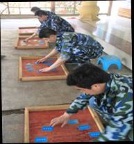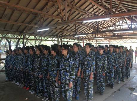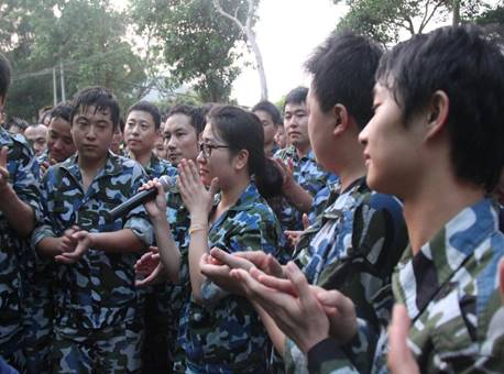 挺胸、抬頭、收腹、提臀、兩腳呈八字45度分隔,兩手自然下垂,中指摸到褲中線,站軍姿嘛,小菜一碟,但15分鐘以后,汗流浹背的我們?cè)贈(zèng)]人輕視這個(gè)項(xiàng)目了。
