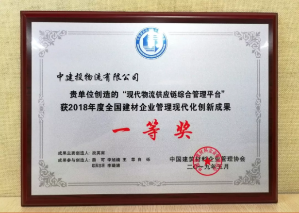 中建投物流獲評(píng)2018年度全國(guó)建材企業(yè)管理現(xiàn)代化創(chuàng)新成果一等獎(jiǎng)