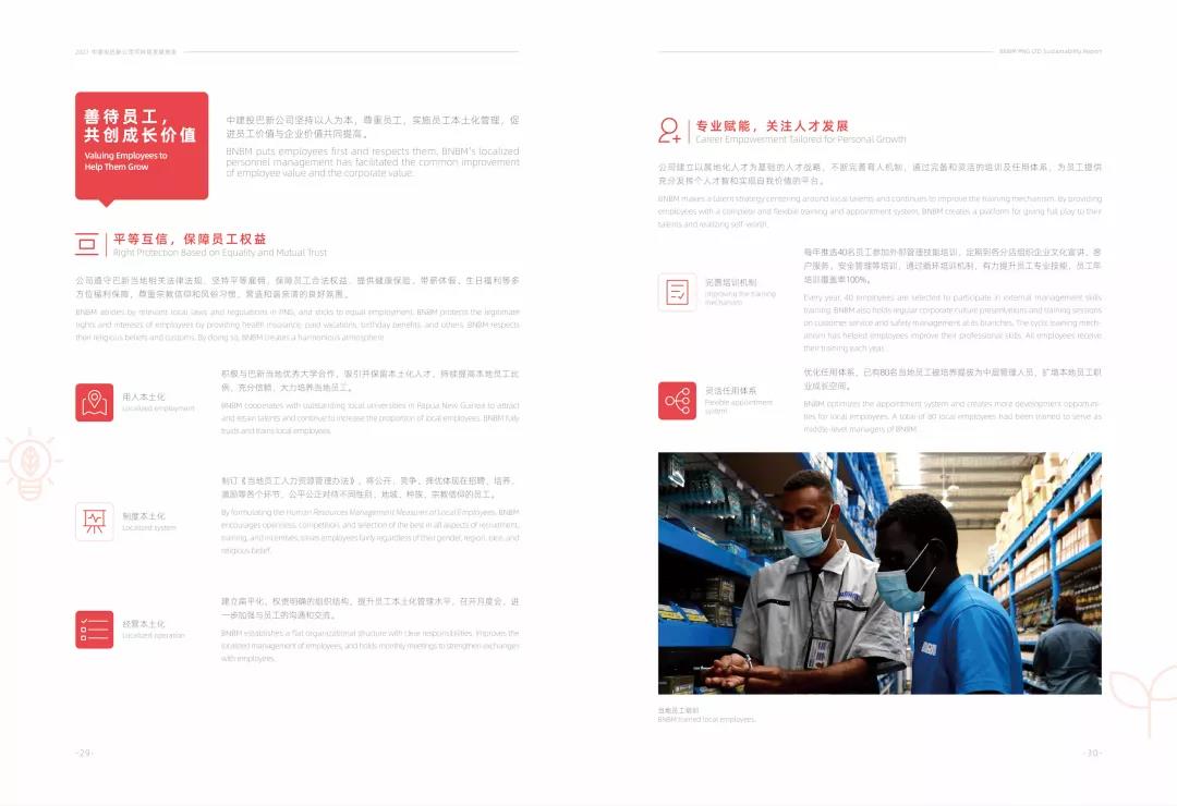 報(bào)告以“善用資源 攜手共建美好未來”為主題,從善用資源、善益伙伴、善待員工、善匯文化、善惠社區(qū)、善對自然六個方面,系統(tǒng)披露中建材投資深度融入“一帶一路”建設(shè),認(rèn)真踐行中國建材集團(tuán)國際化戰(zhàn)略部署,秉持“材料創(chuàng)造美好世界”的企業(yè)使命,緊密圍繞巴新社會經(jīng)濟(jì)發(fā)展需求,大力發(fā)展建材家居連鎖業(yè)務(wù),以負(fù)責(zé)任和可持續(xù)的方式開展經(jīng)營,打造和諧友好的中巴新命運(yùn)共同體,成為兩國互利合作的典范企業(yè)。