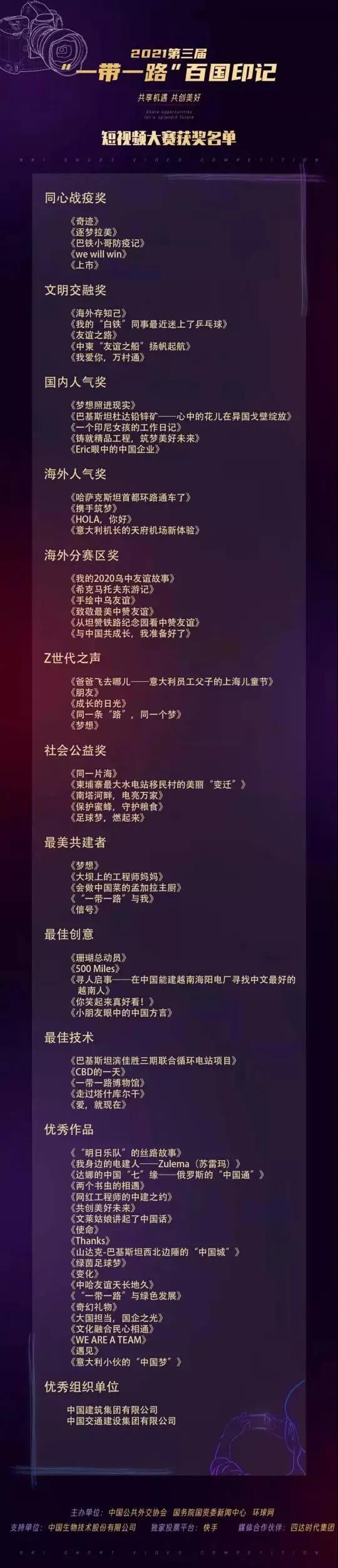 大賽首次采用“中國總賽區(qū)+海外分賽區(qū)”模式,通過短視頻的形式,講述后疫情時代沿線各國共建“一帶一路”故事,展現(xiàn)出全球多國民眾對“一帶一路”倡議所帶來發(fā)展機遇的認可。自今年6月啟動征集以來,大賽組委會共收到來自全球89個國家和地區(qū)的近千部作品投稿。歷經(jīng)初審、公眾投票以及專家評選,70個作品脫穎而出分別獲得“同心戰(zhàn)疫獎”“海外人氣獎”“優(yōu)秀作品”等11個獎項。2家單位獲得優(yōu)秀組織單位獎。大賽所有作品的全球總播放量超過5億,海外播放量達到7000多萬。