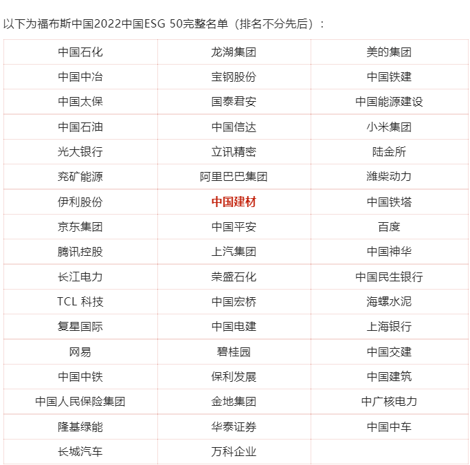 喜報(bào) | 中國建材股份入選福布斯2022中國ESG50