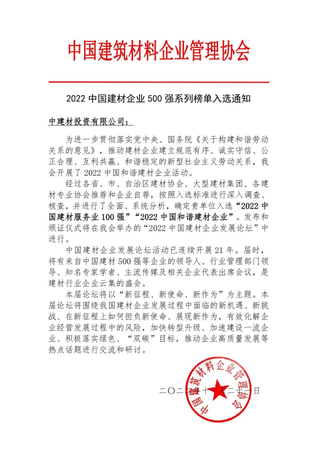 中國建筑材料企業(yè)管理協(xié)會公布了《2022中國建材企業(yè)500強(qiáng)系列榜單入選通知書》,公司入選“2022中國建材服務(wù)業(yè)100強(qiáng)”“2022中國和諧建材企業(yè)”。