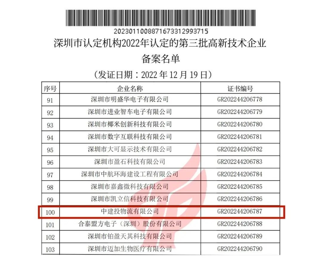 高新技術(shù)企業(yè)認(rèn)定工作網(wǎng)對深圳市公示通過的2022年高新技術(shù)企業(yè)備案名單予以公告,公司所屬中建投物流有限公司位列其中。