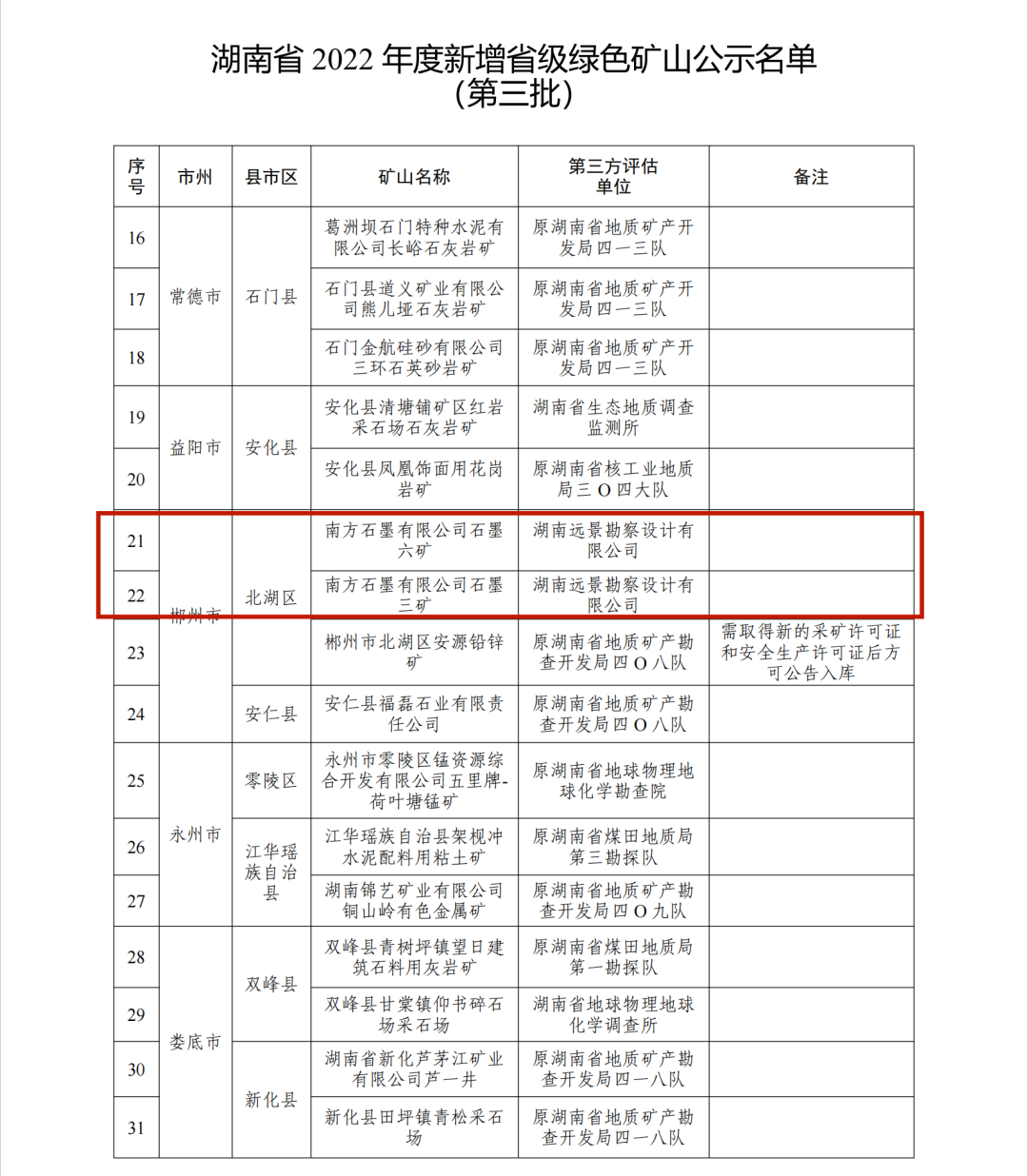 公司所屬南方石墨有限公司2022年已完成2個綠色礦山建設(shè),目前南方石墨在生產(chǎn)礦山已全部獲得湖南省綠色礦山稱號。綠色礦山建設(shè),功在當(dāng)代,利在千秋,守住了“綠水青山”,就是守住了“金山銀山”,南方石墨將持續(xù)保持好綠色礦山建設(shè)成效,讓綠色成為礦山上的亮麗色彩。