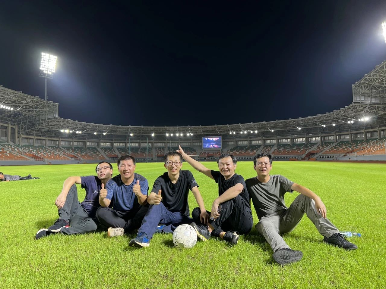 霍建國(guó)與同事在科特迪瓦科霍戈球場(chǎng)